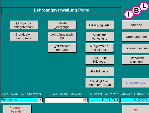 LEHRGANGSVERWALTUNG DIRECT Verwendung: Das Programm dient zur Verwaltung von Mitgliedern, Ausbildern und Lehrgängen im Bereich der Feuerwehren. Die Arbeitsabläufe im Umfeld der Feuerwehrausbildung werden dabei durch nützliche Funktionen unterstützt: 1. Für jeden Lehrgang können die Daten erfasst werden. Aus der Mitgliederdatenbank fügen Sie anschliessend die Teilnehmer einem neuen Lehrgang hinzu. 2. Ausdruck von Einladungsformularen für die Teilnehmer: dazu tragen Sie für jeden Lehrgang die nötigen Voraussetzungen (Grunddaten der Lehrgänge) bzw. der Zeitplan individuell ein. 3. Die Benotungen werden vom Lehrgang automatisch in die Mitgliederverwaltung übernommen. 4. Erzeugbare Ausdrucke je Lehrgang: • Teilnehmerliste, Prüfungsliste • Lehrgangsbescheinigung bzw. Seminarbescheinigung • Beurteilung • Leistungsnachweis (Atemschutz) • Verpflichtungserklärung 5. Für jeden Lehrgang lässt sich ein Stundenplan mit Themen, zugehörigen Lehrgangsorten und Ausbildern erstellen und ausdrucken. 6. Erstellbarer Fragenkatalog für jeden Lehrgang: Aus diesem können vier unterschiedliche Prüfungsbogen durch einfaches "Anklicken" generiert werden. Anschliessend können Sie die Prüfungs- und Lösungsbogen ausdrucken. 7. Ausdruckbare Lehrgangslisten (nach Lehrgangsort sortiert) . 8. In der Lehrgangsstatistik steht eine Übersicht der Lehrgänge eines Jahres mit einer Auswertung des Lehrgangserfolges zur Verfügung.